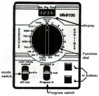 | OPERACION MANUAL Para encender una estacion por un periodo de tiempo indeterminado hay que poner el Funtion Dial en la estacion deseada y poner el Mode Switch en "manual".Ponga el Program switch en el prog. A y luego atras a "run". El display quedara intermitente en la estacion seleccionada. Para apagarlo ponga el Mode Switch en"off/rain" y luego de vuelta a "auto". En caso de lluvia ponga el Mode Swith en "off/rain" |